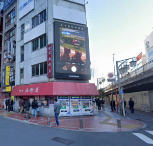 From there, go down the stairs/escalator and go straight to the building with a big video screen directly above a few vending machines. I’ll meet you by those vending machines. The building with the vending machines is marked “Green Peas Building” on the map.